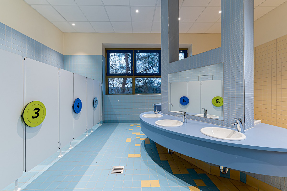 In der Maßnahme „Umbau der Grundschule am Stiefel zur Kindertagesstätte“ wurde die gut erhaltene Bausubstanz des ehem. Schulgebäudes genutzt, um mit modernen Gestaltungselementen eine KiTa zu integrieren. Im Hauptgebäude sind die Gruppenräume untergebracht, die mit warmen Farbtönen und Holzoberflächen nach dem Hamburger Raumkonzept mit spannenden Spiellandschaften gestaltet sind. Dies äußert sich auch in der lebhaften Fassade (Sitzfenster). Aus dem Neubau für Küche und Essen gelangt man über eine Terrasse in den naturnah gestalteten Außenbereich.
