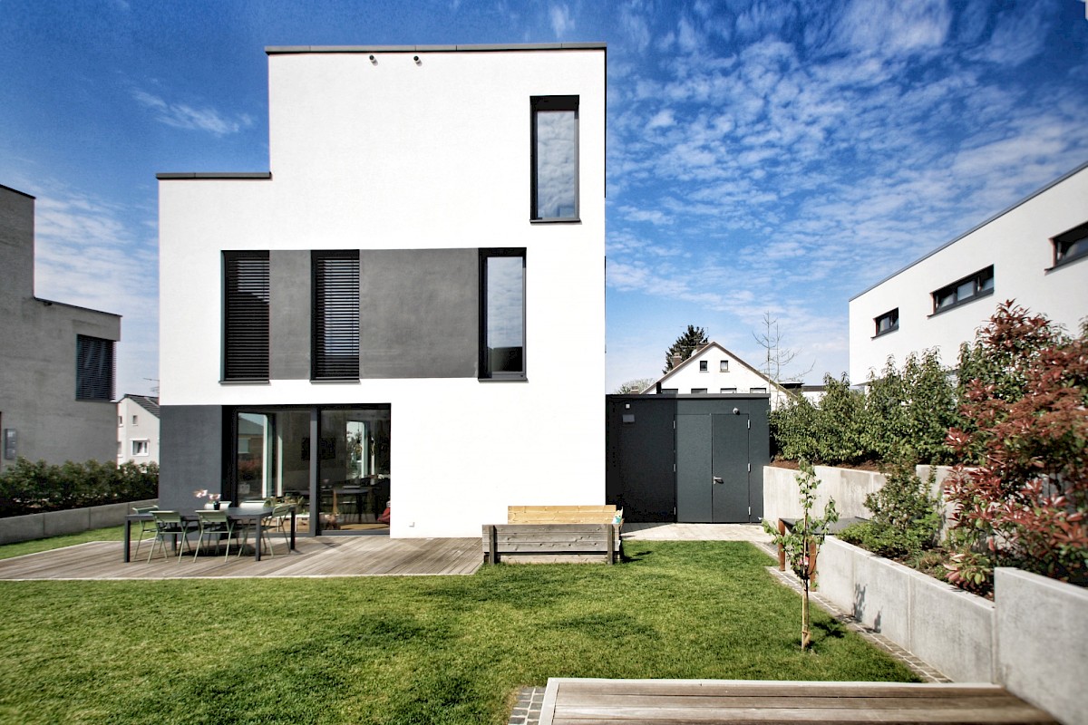 Das freistehende, dreigeschossige Einfamilienhaus bietet eine Raumaufteilung mit tollem Ausblick in alle Himmelsrichtungen. Dieser wird durch raumhohe Fenster und eine große Dachterrasse verstärkt. Diese lichtbetonte Gestaltung wird vor allem an der „Himmelstreppe“ deutlich, die geradlinig vom Erd- bis ins Dachgeschoss leitet. Die minimalistische Architektur wird durch hochwertige weiße Einbaumöbel und Eichenparkett abgerundet und schafft eine gemütliche Atmosphäre. Die landschaftliche Gestaltung des Grundstücks hebt dieses großzügig gestaltete Massivhaus besonders hervor.