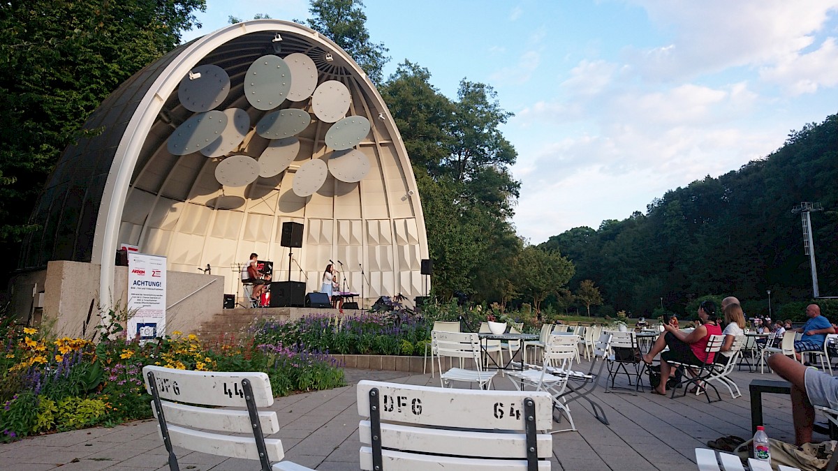 Der, in den 1980iger Jahren vom Architekten Miroslav Volf gestaltete Musikpavillon im DFG dient als Wetterschutz für Aufführungen und ist als einseitig offene Schüssel konzipiert. Bedingt durch die ideale Viertelkugel-Form, die die Schall-Reflexionen auf den Mittelpunkt konzentriert, bestanden akustische Nachteile für die aufführenden Personen. Neue Verkleidungen in Form von pyramidalen Holzkassetten sowie schwebende Ellipsenplatten haben die Akustik erheblich verbessert und den Musikpavillon als attraktiven Veranstaltungsort gestärkt.